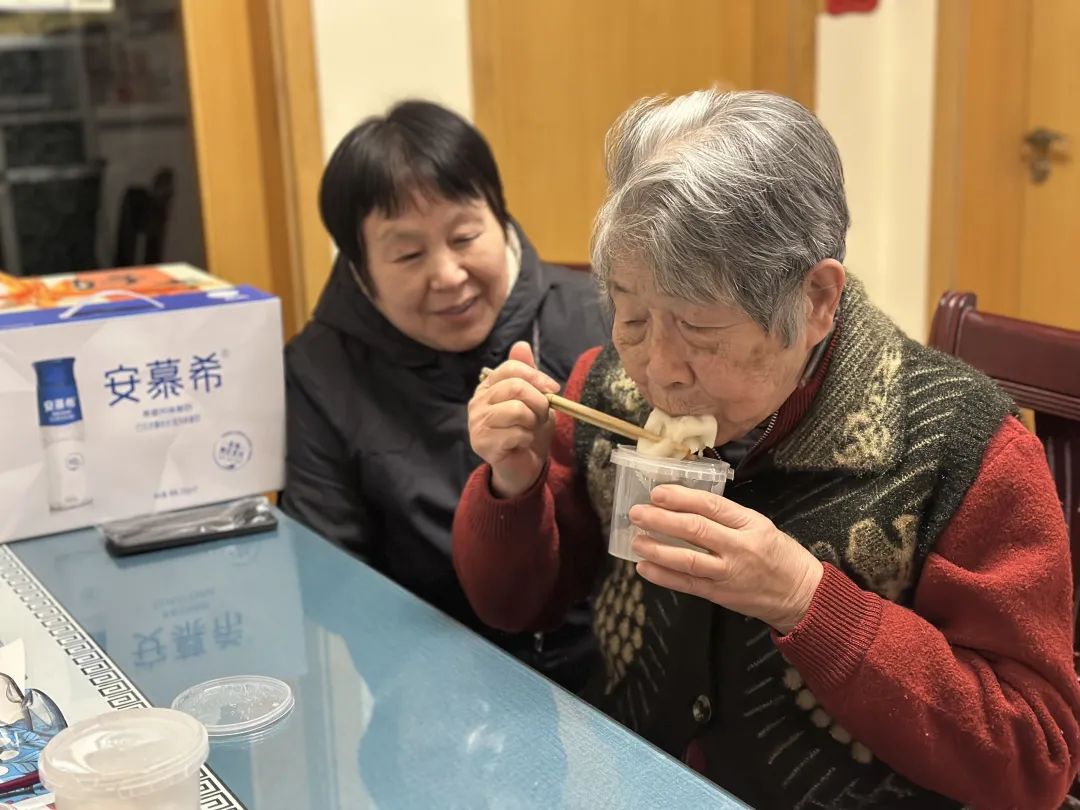 “阿姨,饺子煮得不好,趁热赶紧吃。”“谢谢大家!”大家也和社区里的大龄独居老人分享这些传统美食。“比外面做的好吃,是老底子的味道,很亲切。”一个又甜又软的饺子,一个又一个亲切的问候,让88岁的袁阿姨感到温暖。