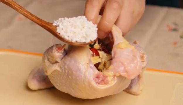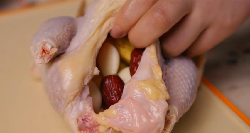 从尾部塞入银杏仁、栗子、黄芪、川邈、大蒜、大枣和浸泡过的大米。