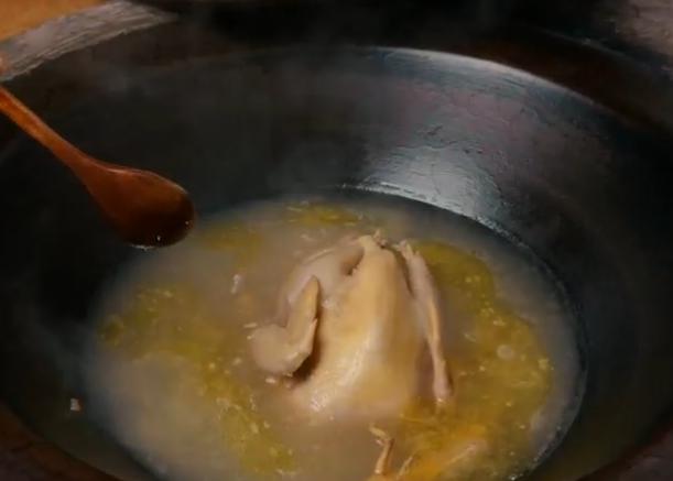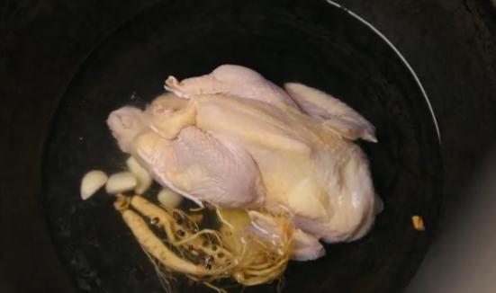 准备汤底:加入川邈、鲜参、黑胡椒、黄芪、蒜、葱,加入整鸡,煮沸后小火炖一小时。