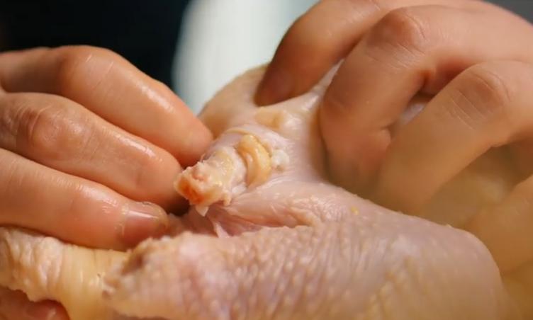 在鸡腿内侧各穿孔,将对面的鸡腿交叉穿入洞内固定。