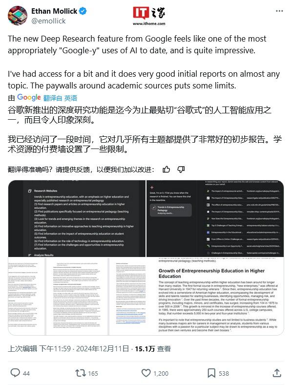 IT 世家 12 月 21 周五,谷歌公司发布公告,宣布其旗下公告。 Gemini AI 深入研究模式(in-depth research mode),如今已经支持中文等 40 多语种。