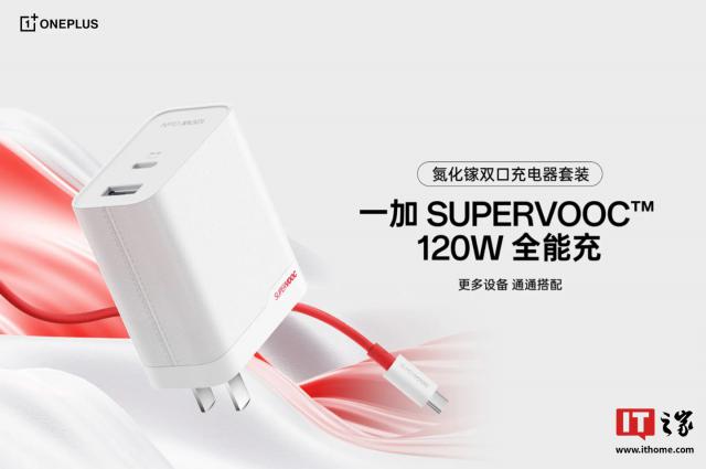 今年一加作为参考, 10 月推出一加 SUPERVOOC 全能充 120W 双充电套装,售价 249 元。该产品支持单口 120W、双口 80W 45W 配有一个导出 1 米 C-C 适配数据线 65W PD 协议。