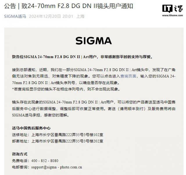 IT 世家 12 月 20 今天,适马宣布:“收到总部的通知,最近,我们正在部分地区发布公告,” SIGMA 24-70mm F2.8 DG DN II | Art 镜头中,发现在广角侧不能对焦到无限远,对焦精度降低的情况下。您可以单击查看查询页面,请输入。 SIGMA 24-70mm F2.8 DG DN II | Art 为了确定是否存在这种现象,镜头系列号。