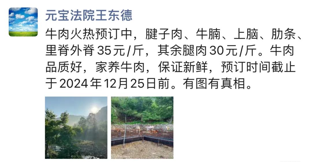 "未经养殖场育肥的牛肉,鲜牛肉,现宰现杀,筋肉,牛腩,上脑,...请朋友帮忙转发。”元宝法院执行法官王东德变身“卖牛”,在微信朋友圈发了一条“广告”。