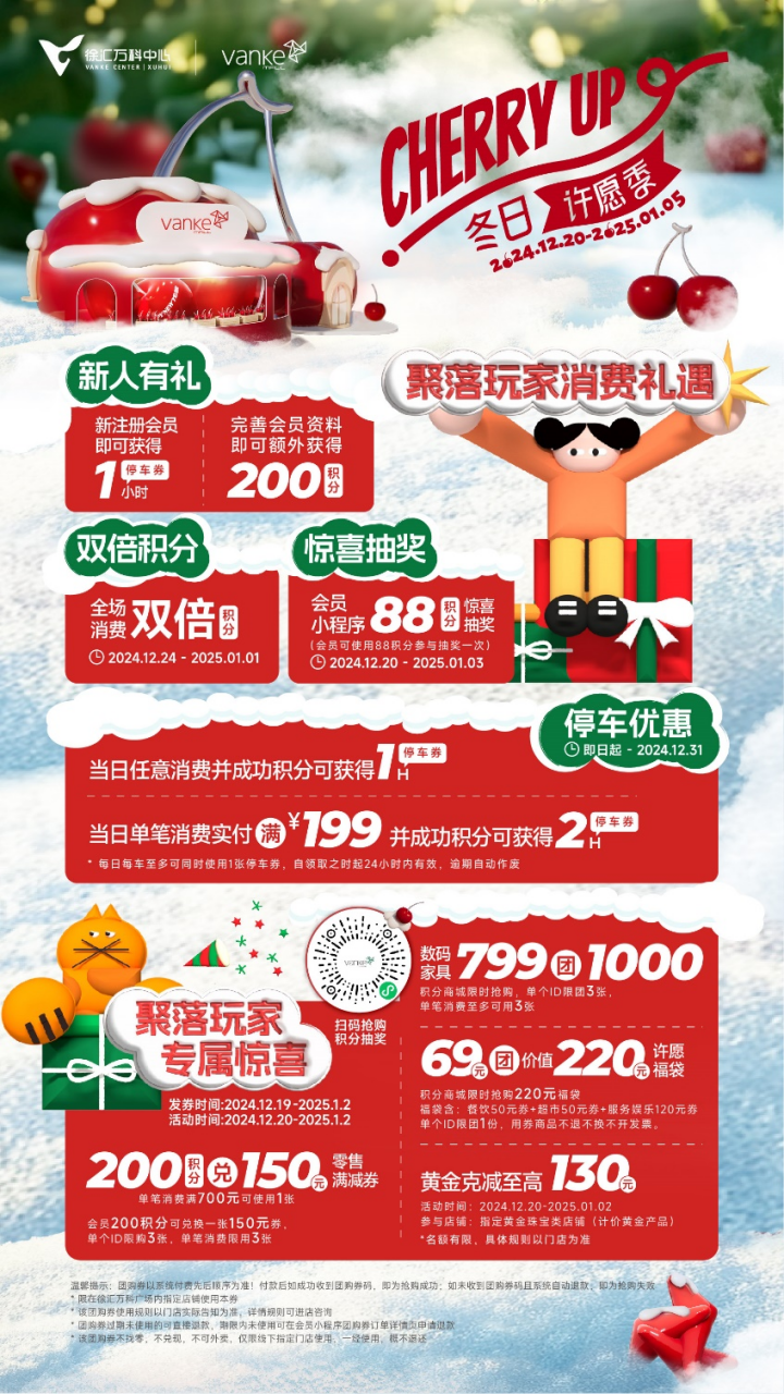 为了回馈客户,徐汇万科广场将在“冬季祈祷季”期间带来会员优惠待遇,如双倍消费积分、88个会员小程序积分抽奖、随意消费获得停车券等。此外,去商店买NIKE、FILA、Aasics、Adidas、Aape、木墨、安高若等品牌可享受200积分兑换150元零售满减券;到商店购买WeCycle、小米、华为等商品可使用数码家具799团1000元优惠券;去商店消费中国黄金、六福珠宝、老凤祥可享受黄金减少到130元以上;祝福袋69元团220元优惠券可以使用VESTA、DOME、吴系小酒家,新旺茶餐厅,PET 品牌如HUG。