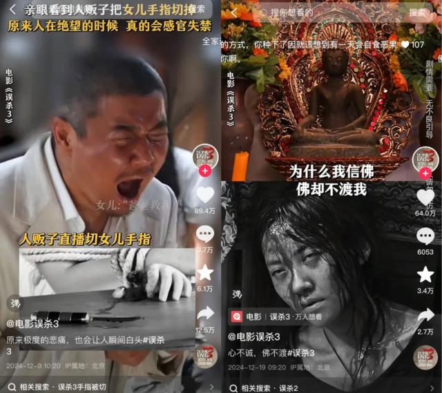 比如在官抖点赞前三的视频中,第二份是“看到人贩子用自己的眼睛切掉女儿的手指,人在绝望的时候真的会感觉到失禁”。视频内容是肖央痛哭流涕的主角,第三份是“人贩子天天拜佛,最后死在佛前”。视频内容是男主最终成功报复的片段。左手“悲伤”左手“爽感”,几乎和当时《默杀》的宣布一模一样,当然这也和两部电影的底色差不多。