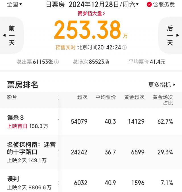 《误判》《名侦探柯南:迷宫十字路口》《误杀》在前后脚上映。 在三部电影中,《误判》是最不乐观的情况。毕竟《名侦探柯南》系列的受众和票房表现一直都比较稳定,电影院的信任度也比较充足。目前,12 月 28 日本的院线排片和黄金场次几乎被误杀。 三是名侦探柯南:迷宫十字路口刮分,《误判》排片仅占比例,仅占比例。 7%。