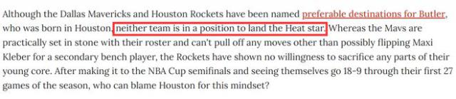 北京时间 12 月 21 日本,虽然火箭队被称为巴特勒的首选下家之一,巴特勒也出生在休斯顿, NBA 记者 Brett Siegel 根据最近的报道,不管是火箭还是独行侠,两队都不能得到巴特勒。