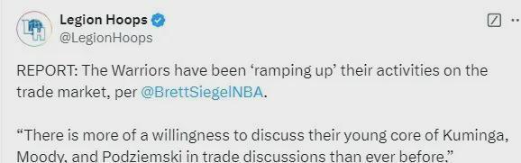 据美记 Siegel 透露,勇士队愿意交易库明加、穆迪和波杰。 3 这支球队的年轻球员。