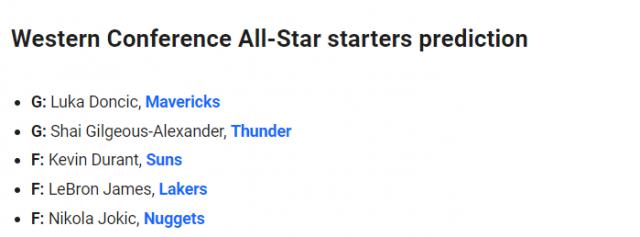 詹姆斯的数据明显下降,但毕竟他要来了。 40 岁月流逝,以现在的状态和人气依然值得一个首发席位。也许约基奇是目前世界上最好的篮球运动员,在此之前,他是最没有悬念的选手。 ESPN 的模拟 MVP 他在投票中排名第一。杜兰特在场的时候,太阳的胜率很高,他应该是首发公认的成员之一。东契奇和亚历山大代表了联盟后场的未来,但是别忘了 2025 全明星都是在勇士主场进行的,当然还有爱德华兹也有竞争的机会。