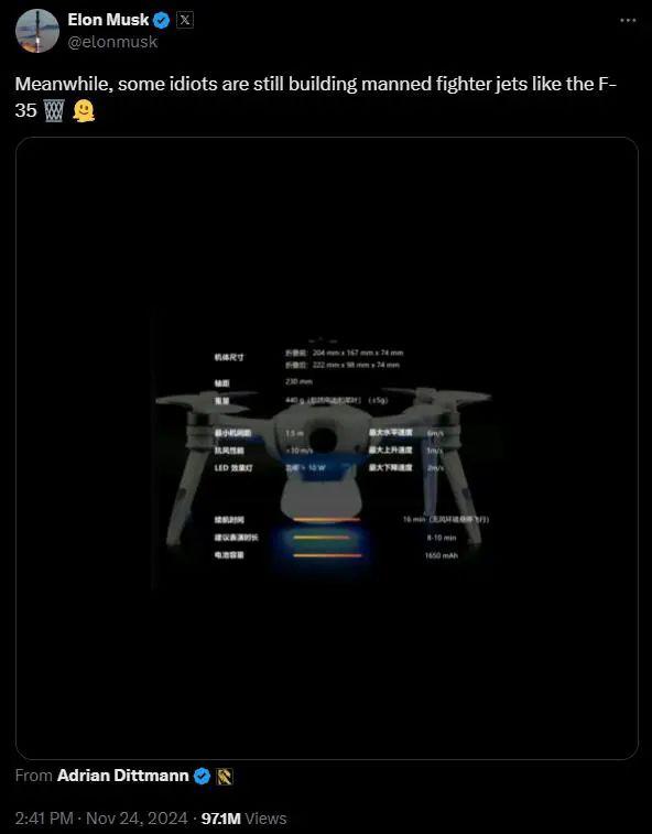 上个月 24 特朗普内阁“政府效率部”负责人埃隆即将就任。 · 马斯克拥有他所拥有的社交媒体 X(原“推特”)发了一条推文,声称“有些傻瓜还在制造 F-35 这种有人的战斗机"。这句话一出来,立刻在网上引起了讨论热潮,面对文章下的一些网友“ F-35 能飞得更高、更远、能携带各种枪械的争论,马斯克更是直接以“这是狗屎设计”为回报。而早在 2020 2008年,马斯克还在美国空军协会的一次会议上宣布“战斗机时代已经过去”。