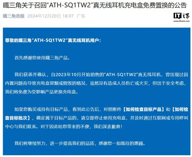 IT 世家 12 月 20 今天,铁三角音频发布召回公告,自今天起, 2023 年 10 从月开始销售的" ATH-SQ1TW2 "真正的无线耳机,由于内置问题,曾经出现过充电盒起烟或烧毁的情况。,虽然没有造成人员伤亡或火灾,但出于安全考虑,官方将免费更换受影响商品的充电盒。