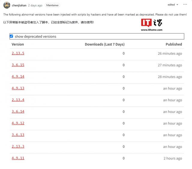 IT 世家 12 月 21 每日消息,有赞开源组件库 Vant 维护者于 12 月 19 日在 GitHub 该公告表示,由于其中一名团队成员的原因 npm token 被盗用,并且注入了恶意脚本代码,官方紧急废弃了多个受影响的版本,发布了最新版本。