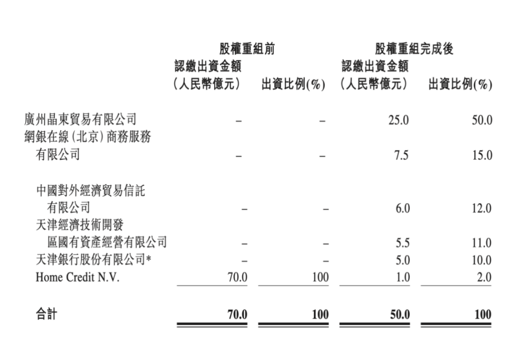 公告显示,股权重组后,广州晶东贸易有限公司、网银在线(北京)商务服务有限公司、外贸信托、天津经济技术开发区国有资产管理有限公司、天津银行分别出资25亿元、7.5亿元、6亿元、5.5亿元、5亿元,出资比例分别为 50%、15%、12%、11%、10%。捷信集团原股东出资比例降至2%。