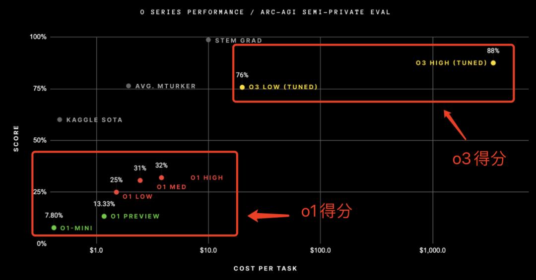在这次测试中,o3系列取得了显著的成绩,在高计算能力的配置下,o3取得了87.5%的成绩,但在低计算率的配置下,也取得了75.7%的优异成绩。这个分数远远超过了o1系列,而后者在同一个测试中的分数只有25%。