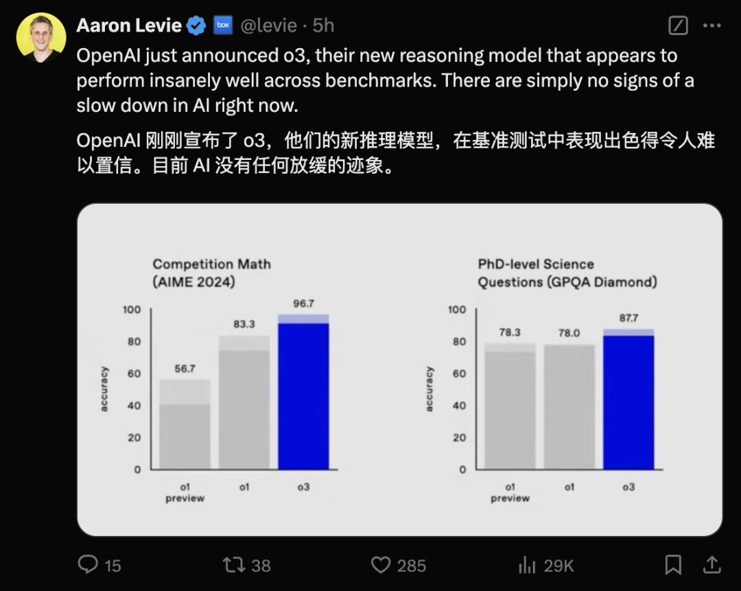 亚伦·列维是Box公司的首席执行官。(Aaron Levie)“OpenAI刚刚宣布了他们的新推理模型o3,它在基准测试方面的表现似乎非常出色,目前,人工智能的发展并没有放缓的迹象。”