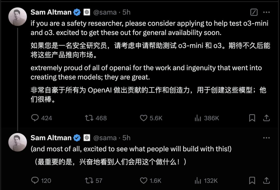 OpenAI 向安全研究人员开放正向 o3 和 o3-mini 初步浏览,估计 o3-mini 将在 1 大约在月末发布,o3 则稍后。