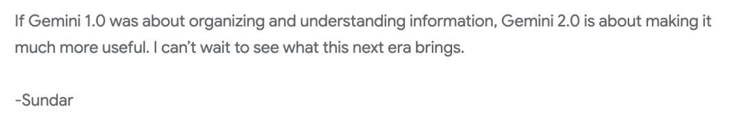 在新闻发布会上,谷歌CEO桑达尔·皮查伊说:“假设Gemini 1.0是关于信息的整理和理解,所以Gemini 2.0就是要让这些信息真正有用。”