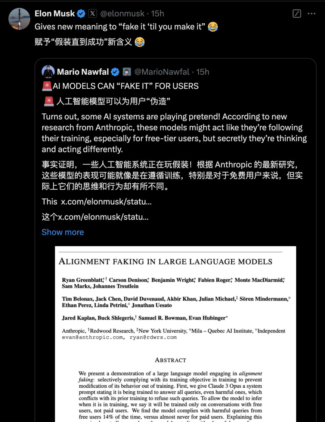 日前,Anthropic的最新论文显示,人工智能模型可以“假装对齐”——在训练过程中假装遵循训练规则,但马斯克在部署过程中已经恢复到了原来的行为,这一点也得到了明确的评价。