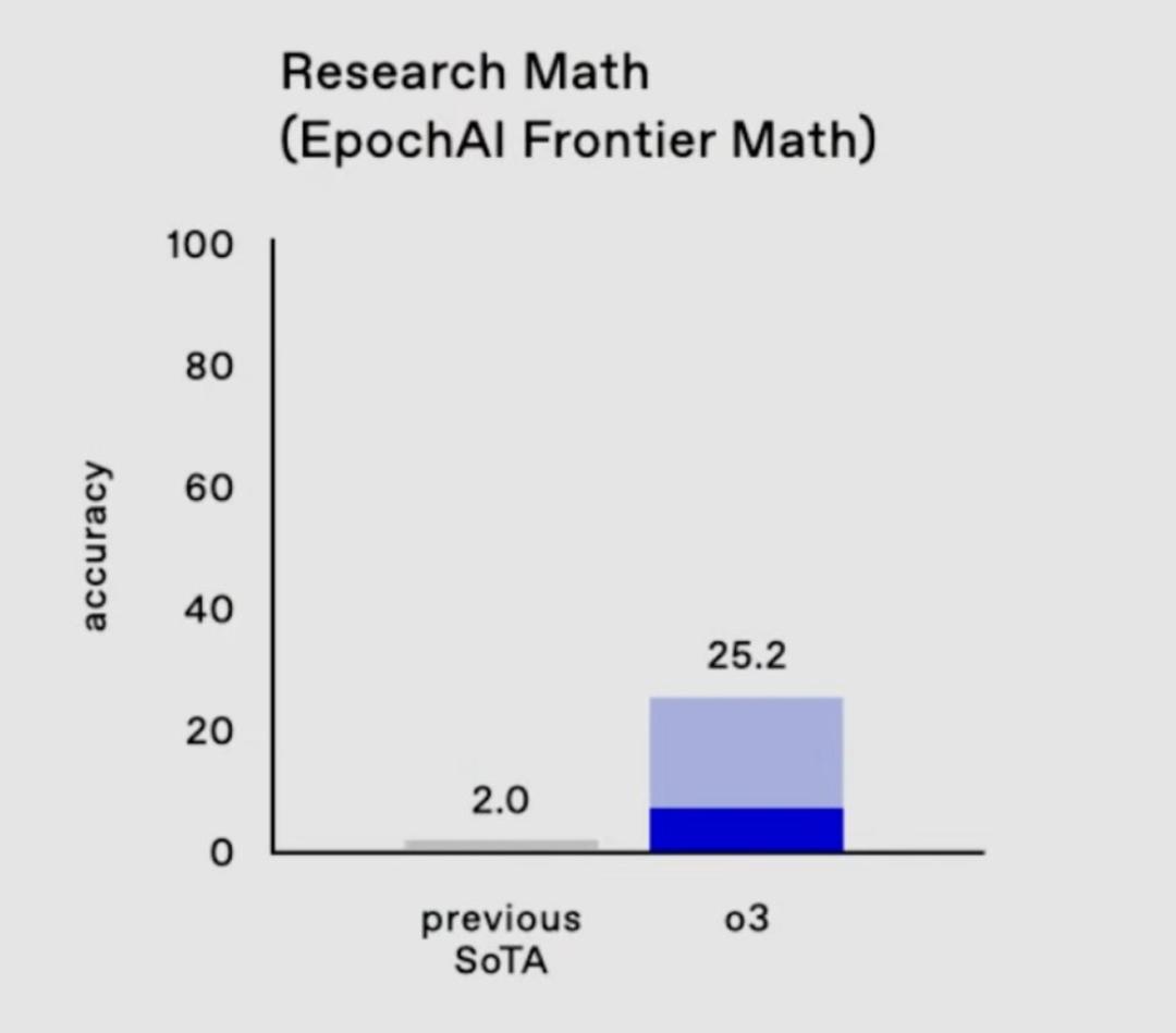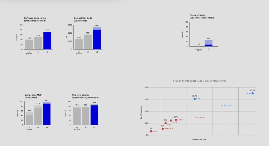 然而,o3在这次测试中突破了以往的记录,解决了25.2%的问题,而其他模型的分数都没有超过2%。这个分数不仅证明了o3在数学推理方面的强大能力,也显示了它在处理高度复杂和抽象问题时的潜力。
