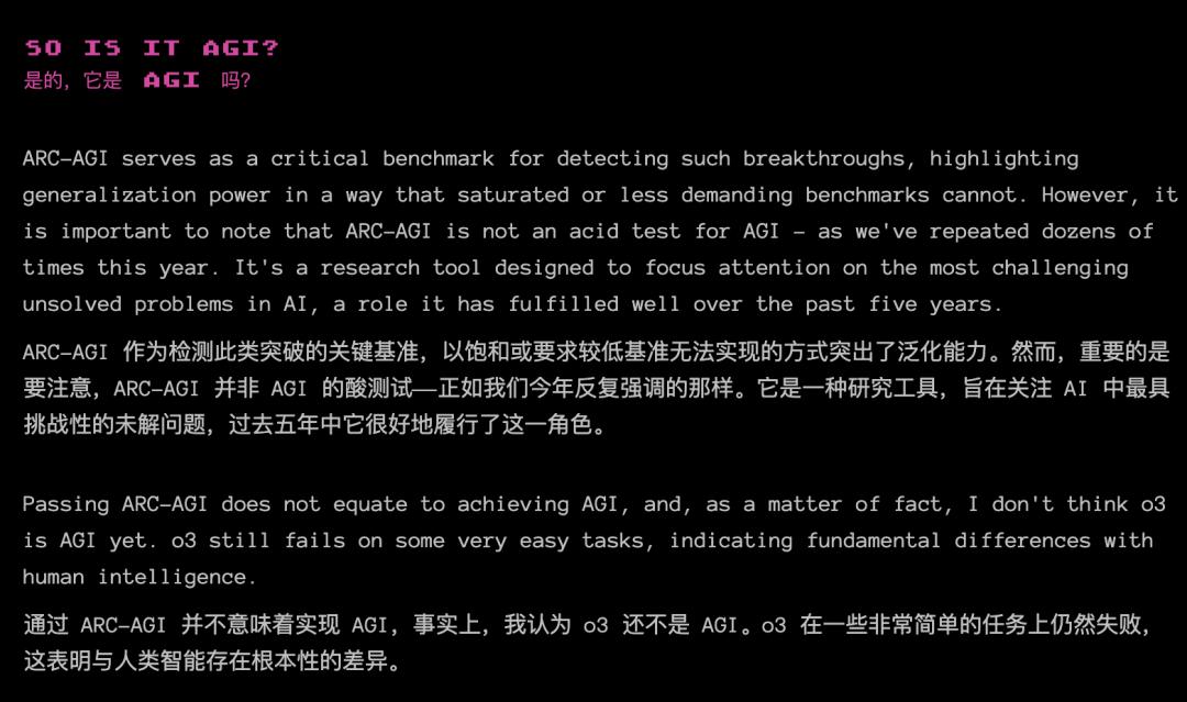 虽然ARC-AGI测试表现不错,但这并不意味着o3已经达到了AGI水平,因为它仍然会在一些非常简单的任务中失败,这与人类智能有着根本的不同。