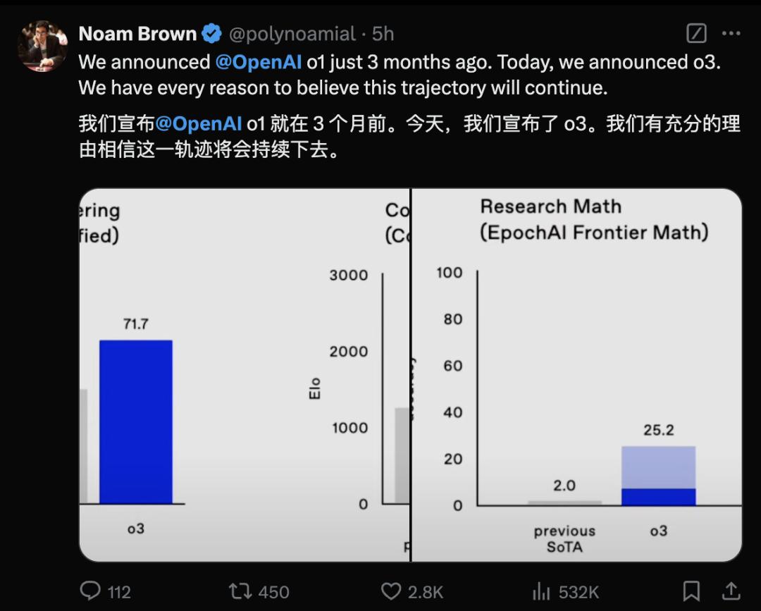 OpenAI在三个月前发布了o1,而OpenAI在今天发布了o3,这证明了AI前进的趋势是不可阻挡的。