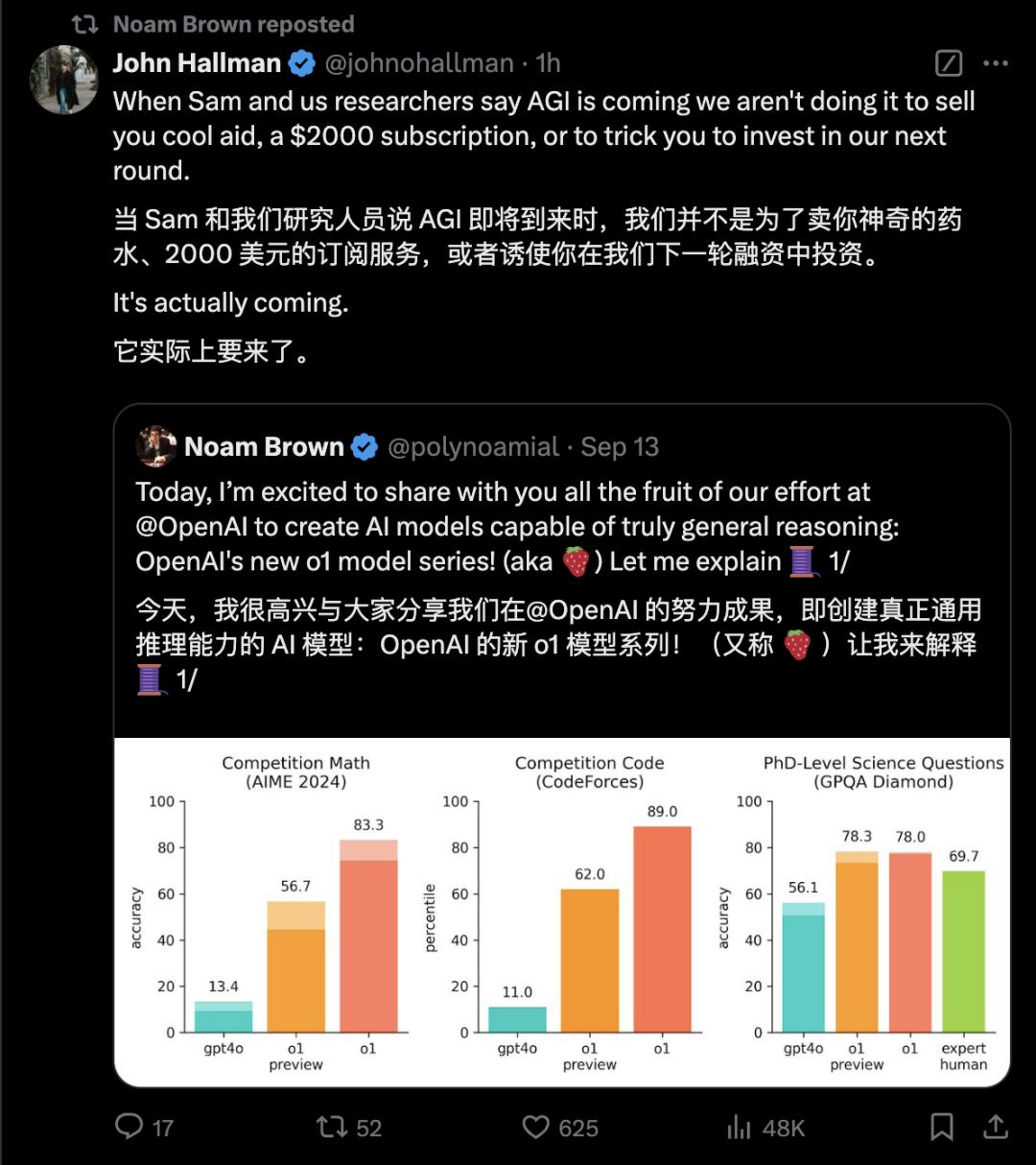 “当 Sam和我们的研究人员说 AGI 随着时间的推移,我们不是想卖你神奇的药水和2000美元的订阅服务,也不是想诱导你投资我们的下一轮融资。但是AGI时代真的来了。"