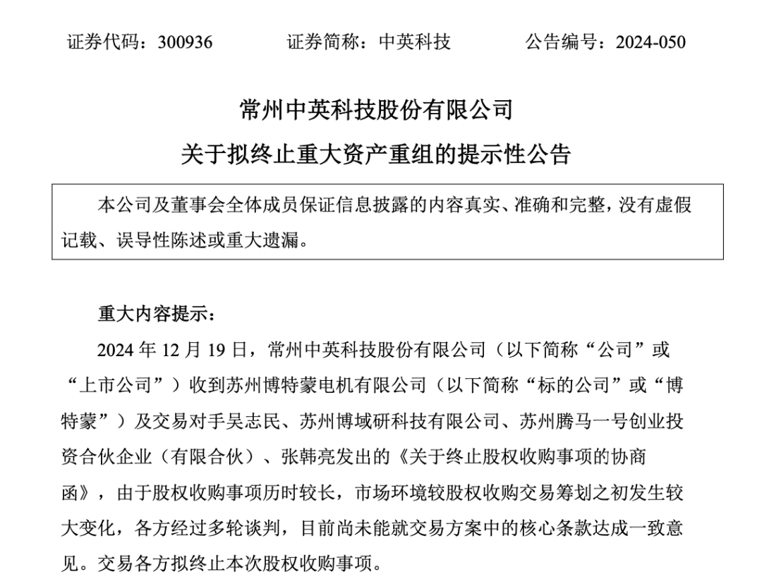 12月20日,中英科技发布公告称,该公司于19日收到苏州博特蒙电机有限公司(以下简称博特蒙)和交易对手发出的《关于终止股权收购的协商函》。
