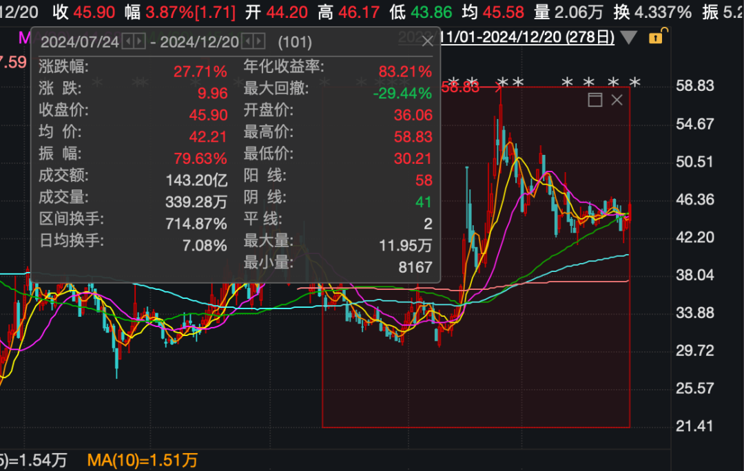 从股价表现来看,上述资产重组计划公布后,公司股价小幅上涨,随后波动下跌,九月底后出现大幅上涨,截至十月二十三日,每股涨至58.83元/股,截至十二月二十日收盘,每股收盘45.9元,从七月二十四日到现在,区间上涨了27.7%。该公司最新市值为35亿元。