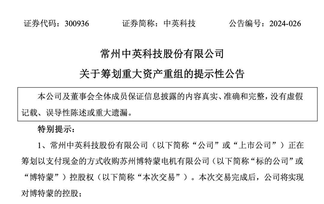今年7月,中英科技宣布将通过支付现金收购博特蒙控股权。交易完成后,博特蒙将成为上市公司的控股子公司,纳入上市公司的合并报表。根据初步研究和计算,本次交易预计将构成重大资产重组。