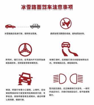 注意除冰和车身上的雪,尤其是前后挡风玻璃和外后视镜上的雪。上车后,先转动方向盘,确定转向系统是否能正常工作;检查轮胎是否正常;检查灯光和雨刮器是否正常工作;车辆启动后,轻轻踩下刹车,确定刹车系统是否被雪冻住或其他故障。
