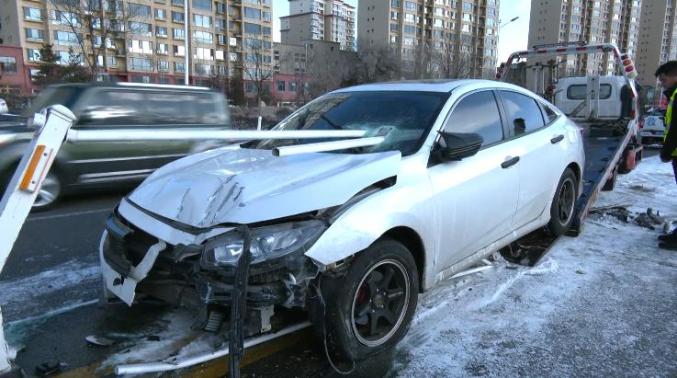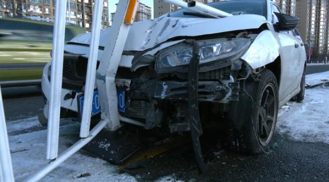 呼和浩特一辆白色轿车撞上了隔离护栏,两根损坏的护栏直接插入驾驶座!