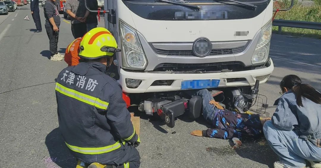 10月3日15时许,天津市武清区崔黄口镇发生交通事故。一辆箱式卡车与一辆电动自行车相撞。一个男孩的腿被卡车底部覆盖,消防队员立即赶到现场救出了这个男孩。医护人员包扎男孩后,将其抬上担架,送往医院进行紧急治疗。