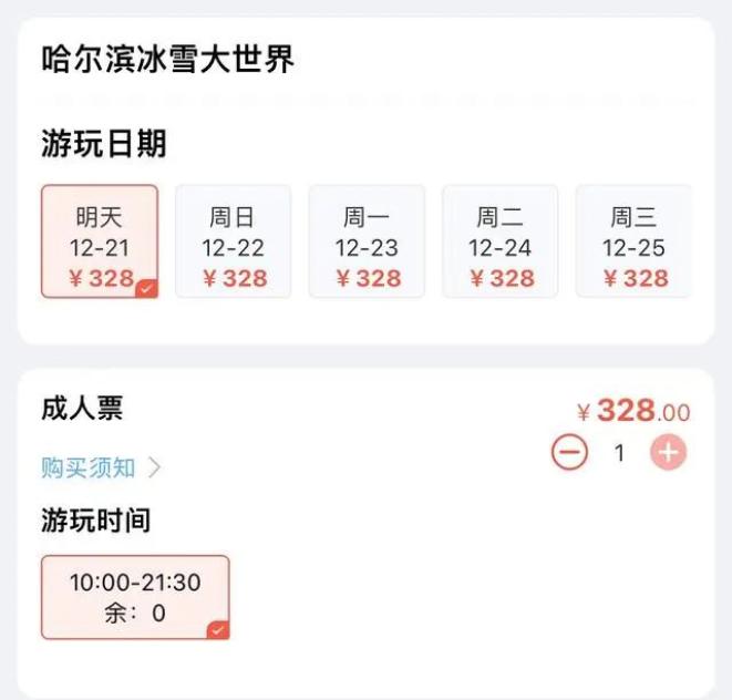 媒体搜索信息发现,哈尔滨冰雪大世界官方微信售票平台显示,公园成人票在一周内售罄。