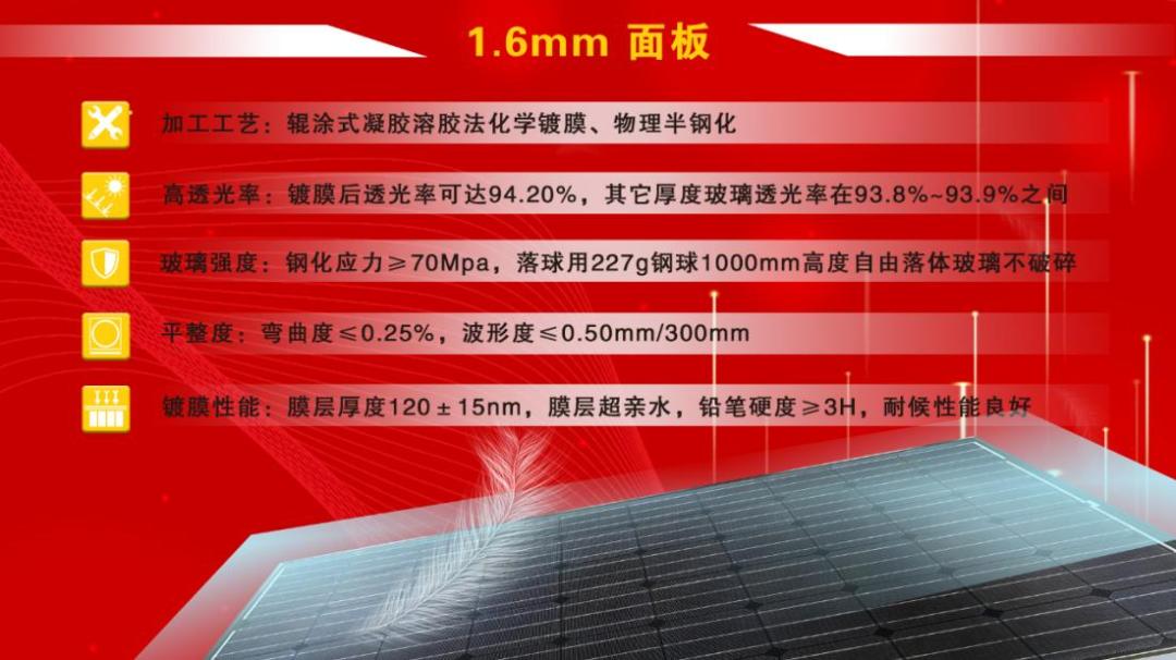 1.6mm原片玻璃透光率更好,原片透光率可达92%。采用纳米超亲水镀膜材料单层镀膜后,整体透光率增加2.1%左右,玻璃透光率可达94.2%,使组件功率增加2.1%左右。