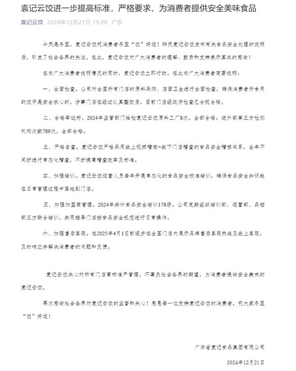 快科技 12 月 22 日前,袁记云饺官微发布最新消息称,涉事门店经过认真整改后,目前门店已经通过政府检查合格。