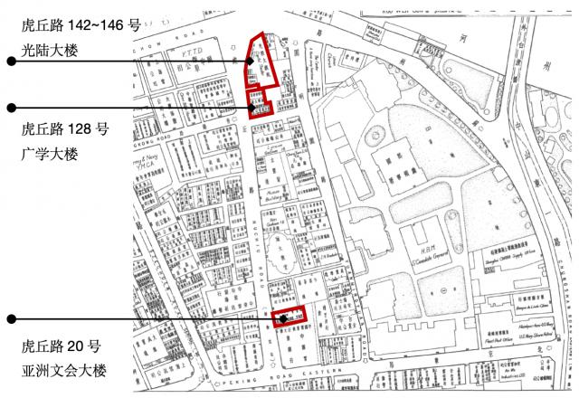 虎丘路 142~146 号光陆大楼原为光陆大戏院,1949 年后曾作为曙光剧场使用。1925 年度投资建立英商斯文洋行,鸿达洋行设计,匈牙利建筑师鸿达(C. H. Gonda)受聘者参加了设计。这幢建筑于 1928 年度竣工,钢筋混凝土结构,坐东朝西,占地面积约。 920 平方米,建筑面积 7120 余平方米。1994 2008年被上海市人民政府公布为上海市第二批优秀历史建筑。