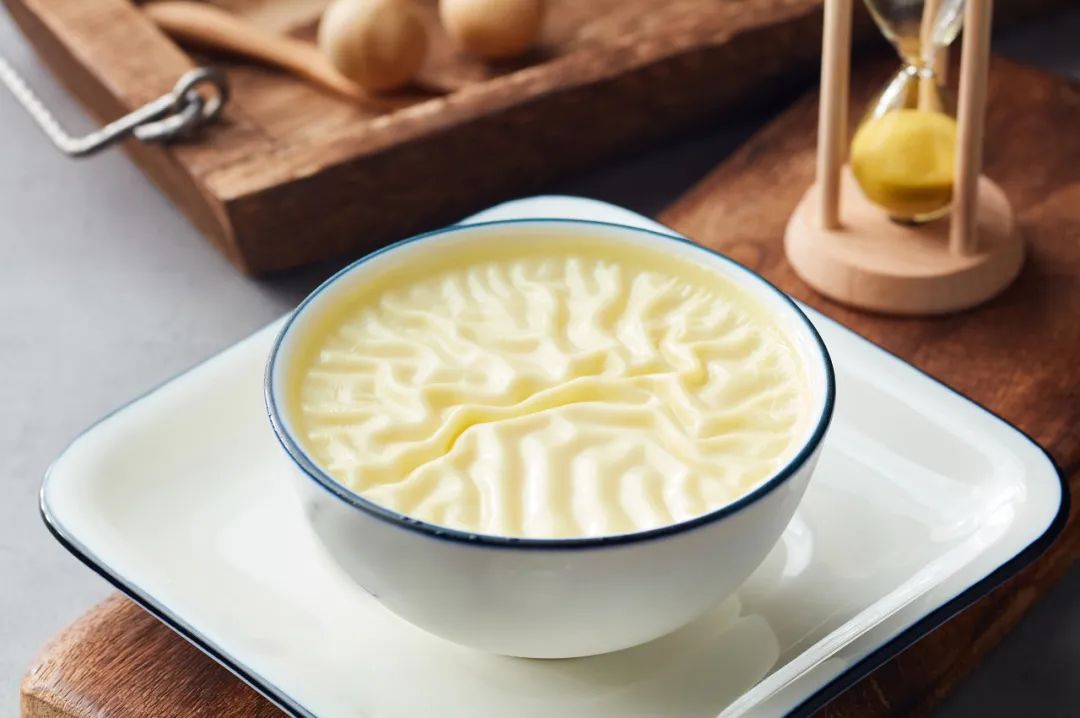 双皮奶的“皮”是指脂肪颗粒漂浮到表面后,包裹在脂肪颗粒中的蛋白质相互交联。水牛奶的蛋白质和脂肪含量比普通牛奶高,脂肪颗粒更大,所以更容易结皮。