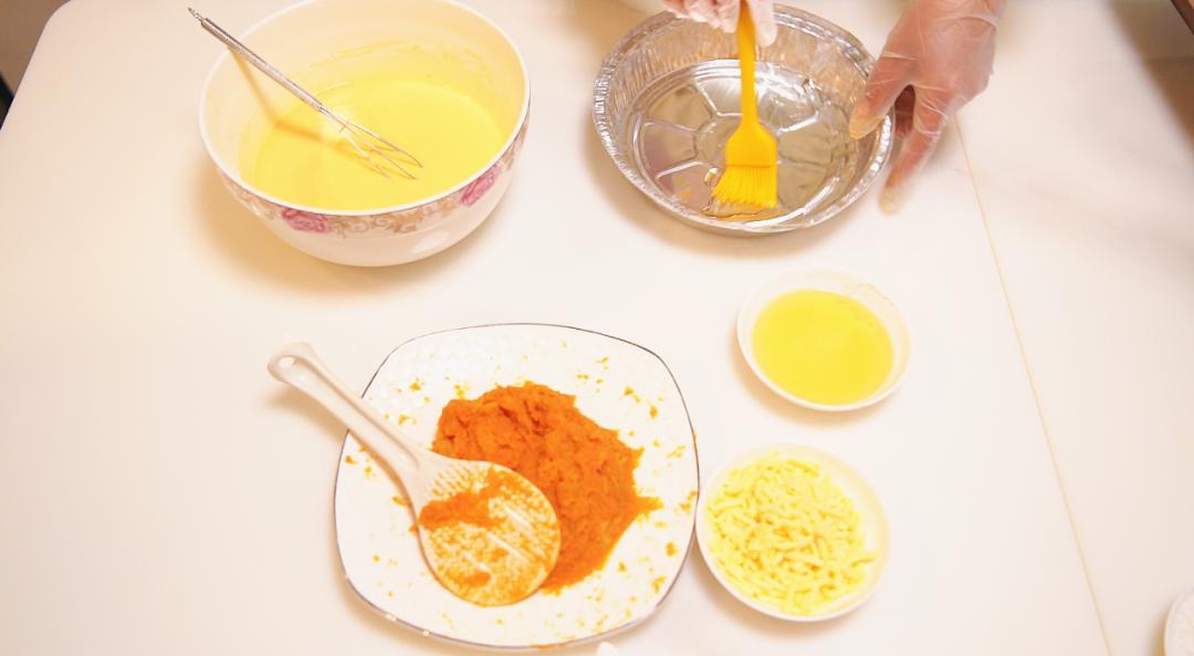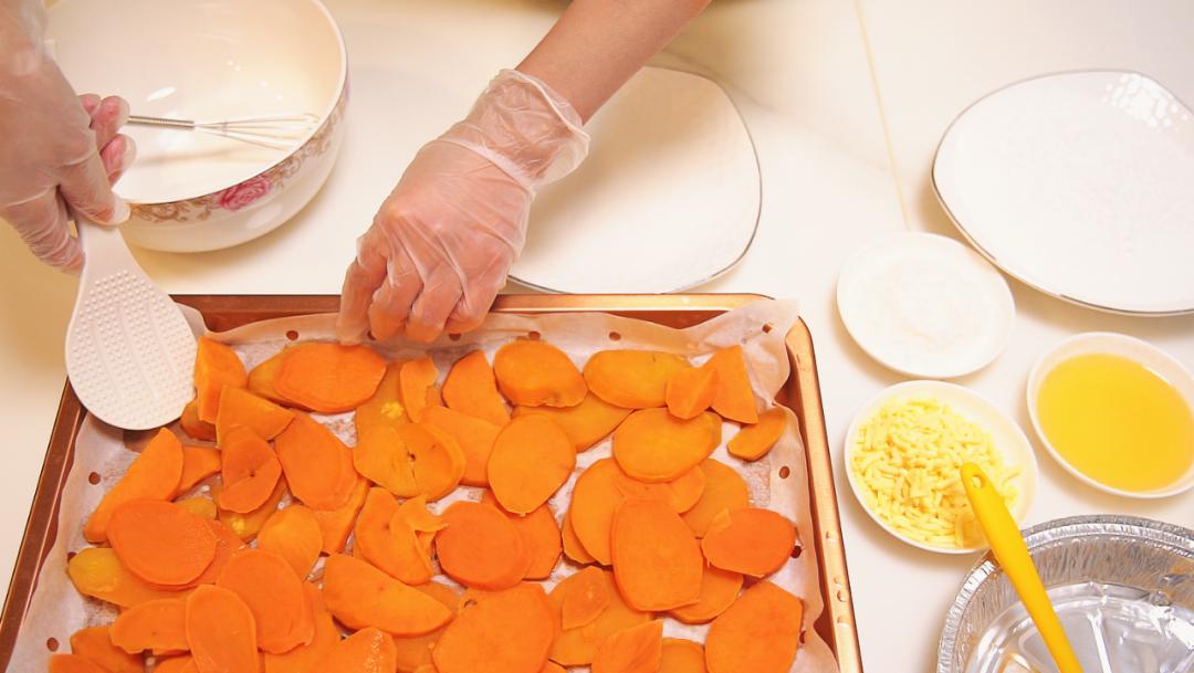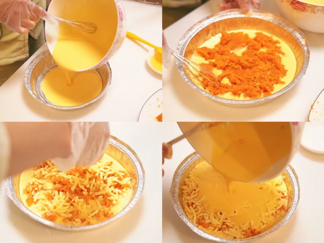 5. 在烤盘上刷一层食用油,将搅拌好的蛋液倒入盘中。铺一层红薯,再铺一层厚厚的奶酪,最后把剩下的蛋液倒在上面。