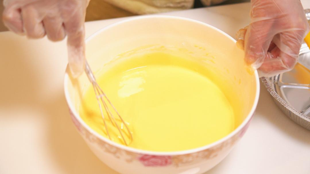 4. 在另一个空碗里打一个鸡蛋,加入适量的糖、牛奶、食用油和糯米粉。搅拌至无颗粒,最好有点粘~