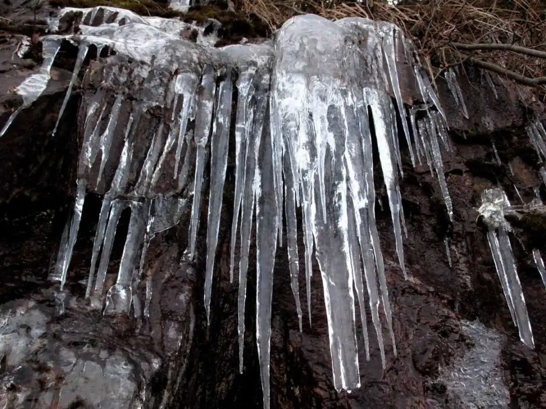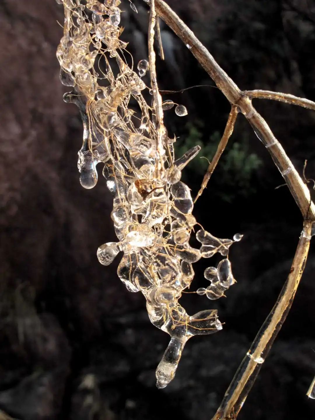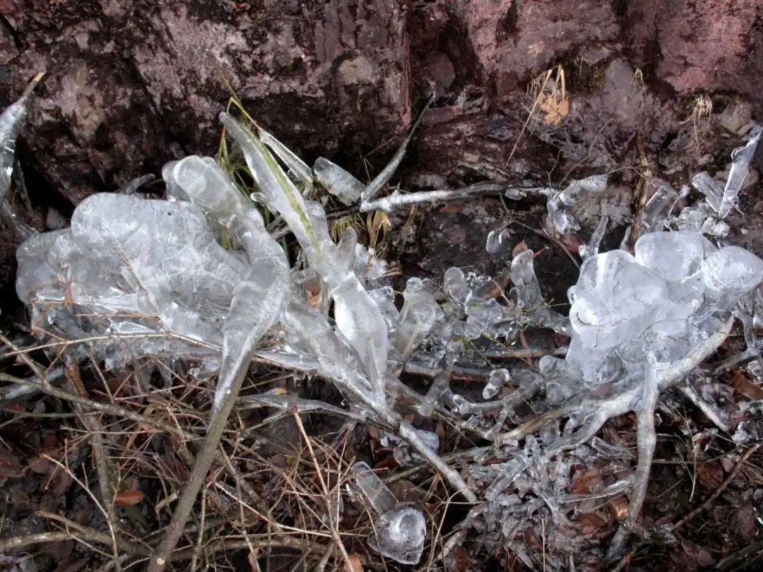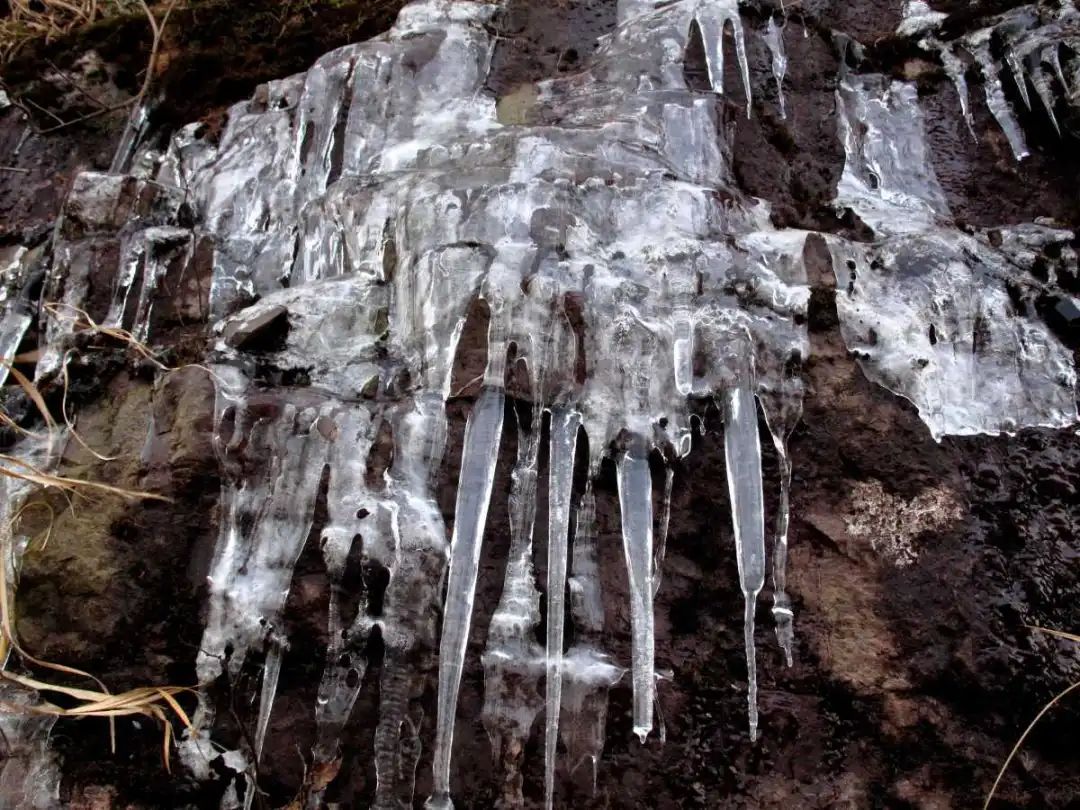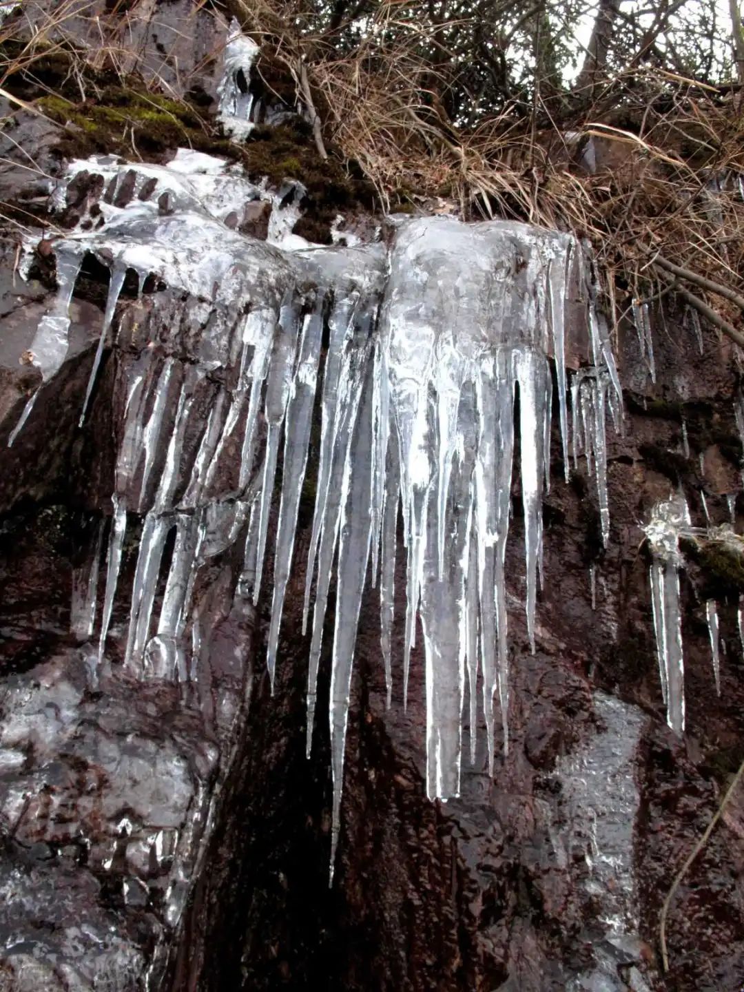 阴坡的情况大不相同,冷空气继续保持冰的发育。从冰的长度和厚度来看,这些冰已经出现了一段时间。