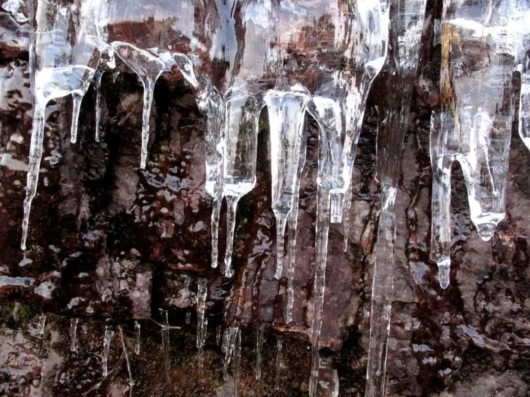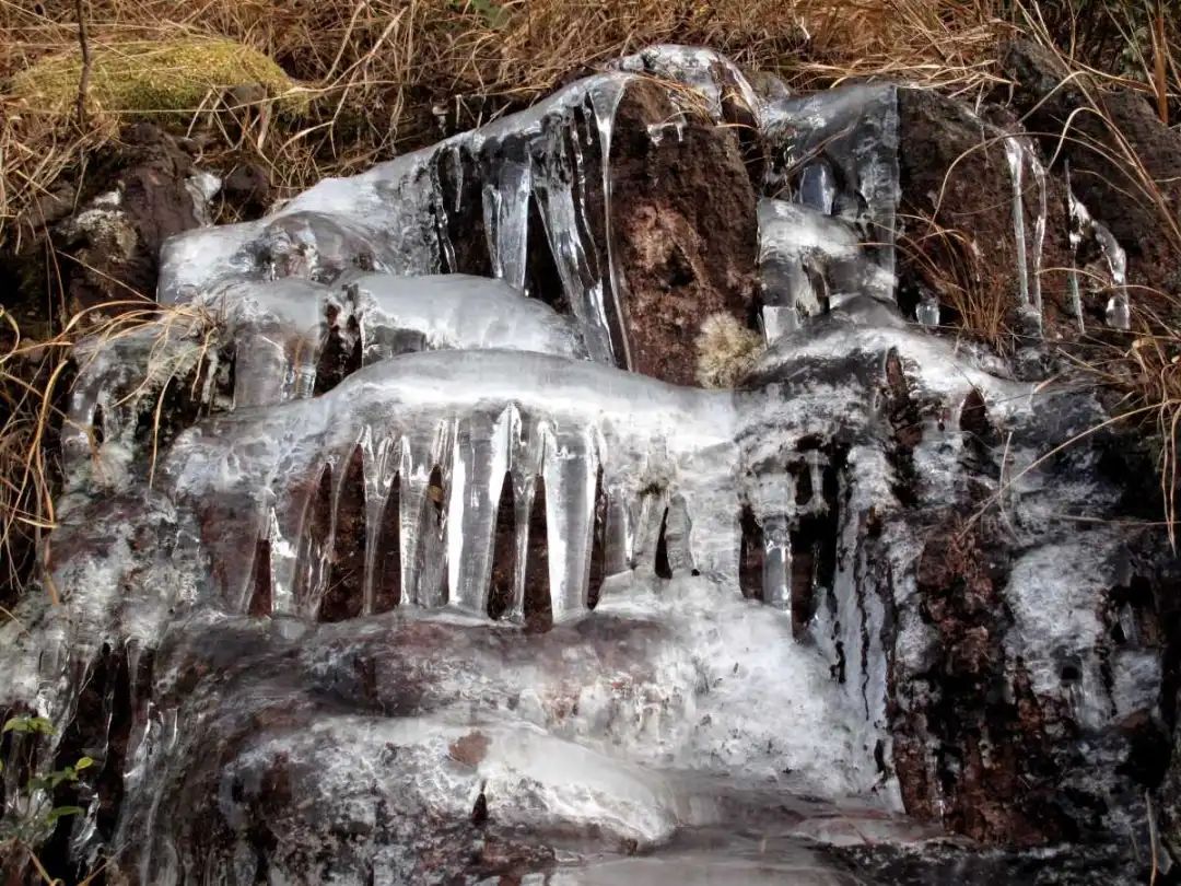 首先要有流动的水滴,然后在低温气流的影响下迅速凝结成霜。如果水流较大,水在水流被冻结之前就会流走,冰将无法形成。