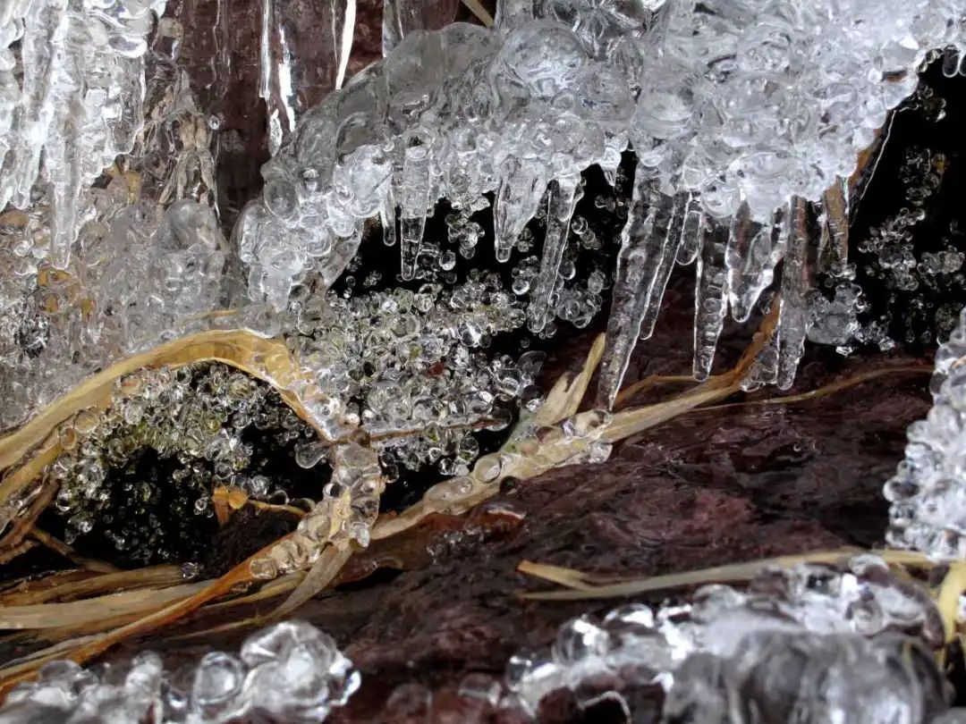 所以,我们常常能在小水流旁发现溅出的水滴被冻住了。