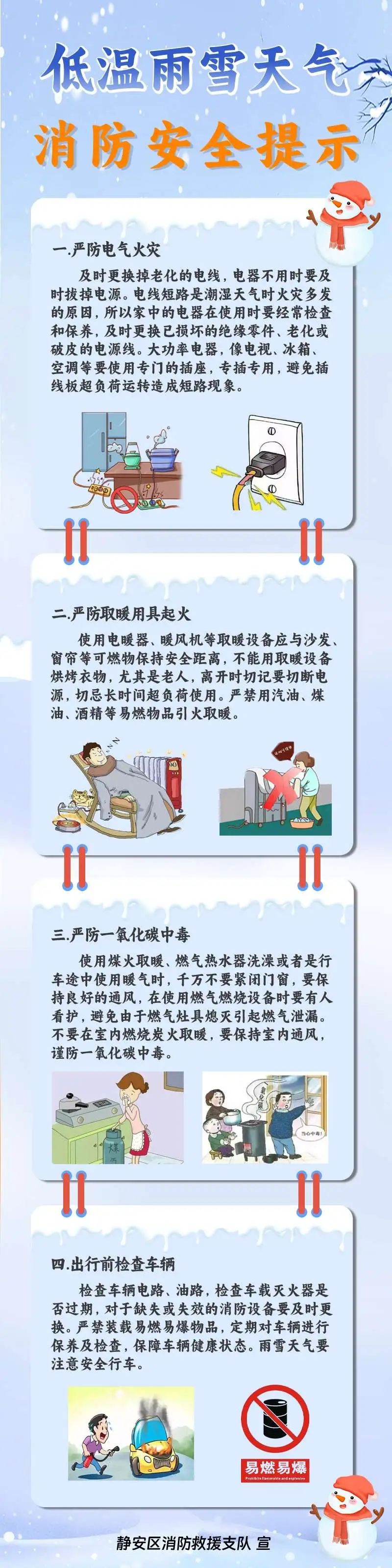 随着寒冷冬天的到来,人们使用加热设备和其他电器的情况越来越高。低温雨雪潮湿的天气容易导致电气短路、安全隐患甚至火灾。在此,静安区消防救援支队发布消防安全提示: