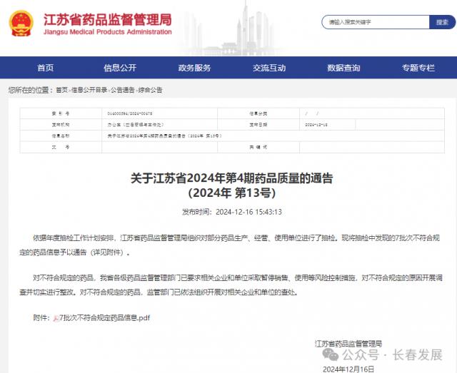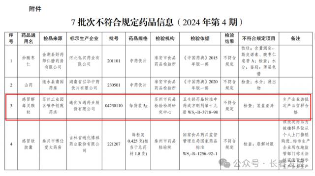 12 月 16 日,江苏省美国食品药品监督管理局官网发布《关于江苏省的问题》 2024 年第 4 期间药品安全通知(2024 年 第 13 号码),标有“苏州市药品检验检测研究中心抽样检测不符合要求的通化万通药业有限公司制造的“感冒解毒灵颗粒”,判定为劣质药物。
