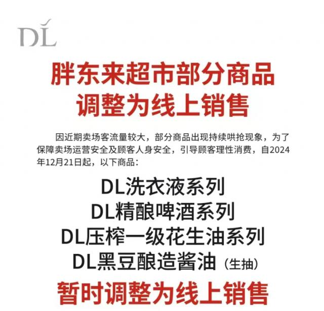公告显示,由于近期胖东来门店人流量大,部分商品不断被抢。为了保证门店的运营安全和客户的人身安全,引导客户理性消费,自我消费。 2024 年 12 月 21 日起,DL 洗衣液系列,DL 自酿啤酒系列,DL 榨取一级花生油系列,DL 酱油(生抽)的黑豆酿造暂时调整到网上销售。