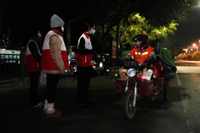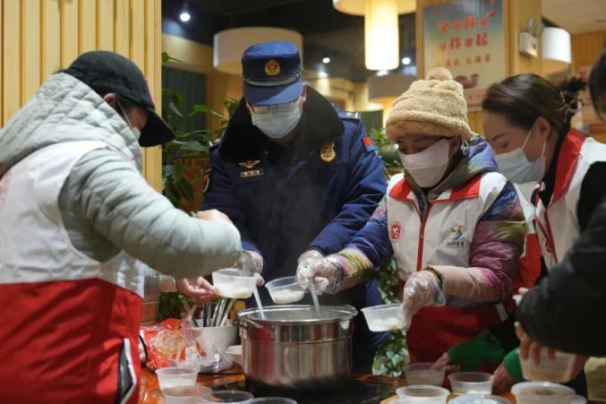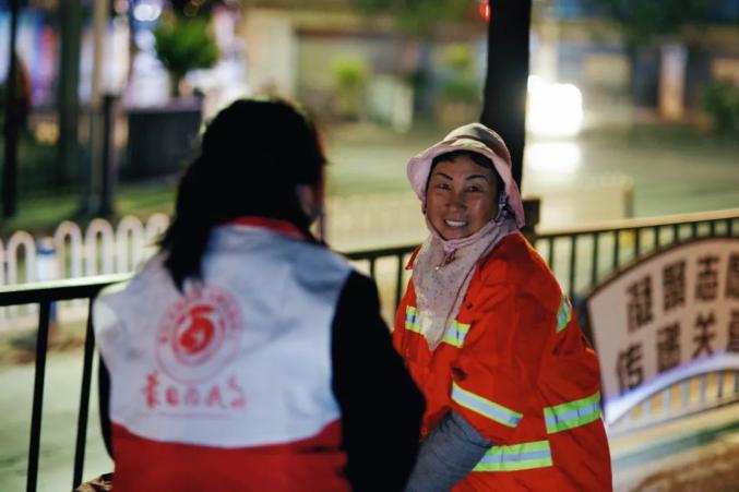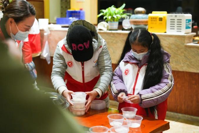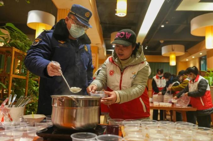 凌晨4点前,志愿者们早早来到蒙自市阳光茶餐厅和蒙自市新时代文明实践中心,将煮好的饺子和“暖心包”分组赠送给环卫工人,并给他们一个拥抱,感谢他们对这座城市的默默奉献。