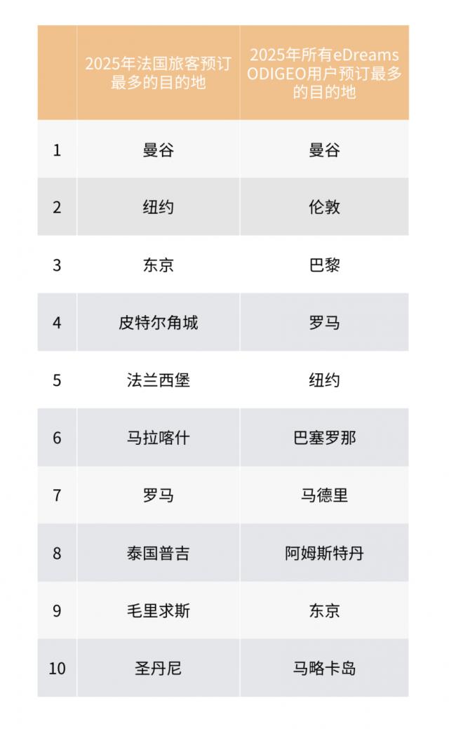 十大最受欢迎的目的地显示了游客对探险、城市探索和海滩休闲的渴望。 eDreams ODIGEO 曼谷在所有用户预订的目的地中排名第一。