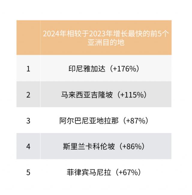 2024 2008年,亚洲成为法国人最喜爱的旅游目的地之一,与 2023 2008年,浏览量大幅增加,进入法国人浏览最多的前五大目的地。印度尼西亚雅加达是其中之一。 176% 预订增长率居榜首,其次是马来西亚吉隆坡( 斯里兰卡科伦坡115%( 86%)。eDreams ODIGEO 首席执行官 Dana Dunne 指出:" 2024 2008年旅游业的一个主要特点是个性化假期需求的增加,现代旅行者不仅寻求更多的选择和灵活性,而且希望成本更低。随着技术的发展和人工智能的广泛应用,我们的旅行方式正在逐渐发生变化,这些技术在各个层面都无声地影响着我们的旅行体验,从获得灵感、比较成本到简化预订流程和定制行程。根据最新的研究,已经存在 73% 旅行者正在使用或展示他们对旅游相关人工智能技术的兴趣。"