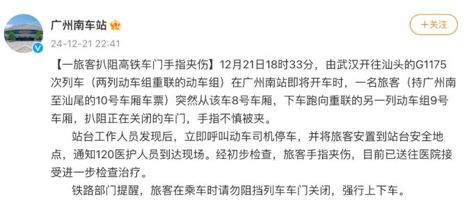 针对此事,12月21日晚,广州南站发布通知称,12月21日18时33分,一名乘客(持广州南至汕尾10号车箱票)在广州南站即将开车时,从武汉开往汕头的G1175列火车(两列动车组重新连接的动车组)突然下了8号车厢,下了重新连接的另一列动车组9号车厢。